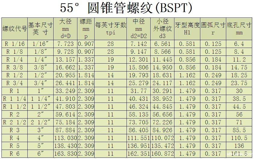 另外螺纹中的1/4、1/2、1/8 标记是指螺纹尺寸的直径,单位是英寸.“行内人”通常用“分”来称呼螺纹尺寸,一英寸等于8分,1/4英寸就是2分,如此类推.G 就是管螺纹的统称(Guan),55,60度的划分属于功能性的,俗称管圆。即螺纹由一圆柱面加工而成。