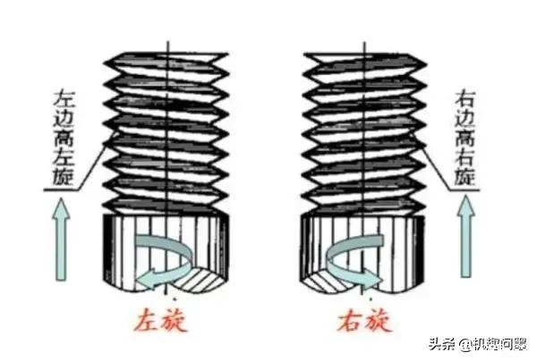 扩展:1.螺纹旋向快速判别放法:将螺杆垂直于地面,看螺纹牙的那条斜线,左边高左旋,右边高右旋;右旋螺纹顺时针拧时旋入,左旋顺时针拧旋出,如下图;