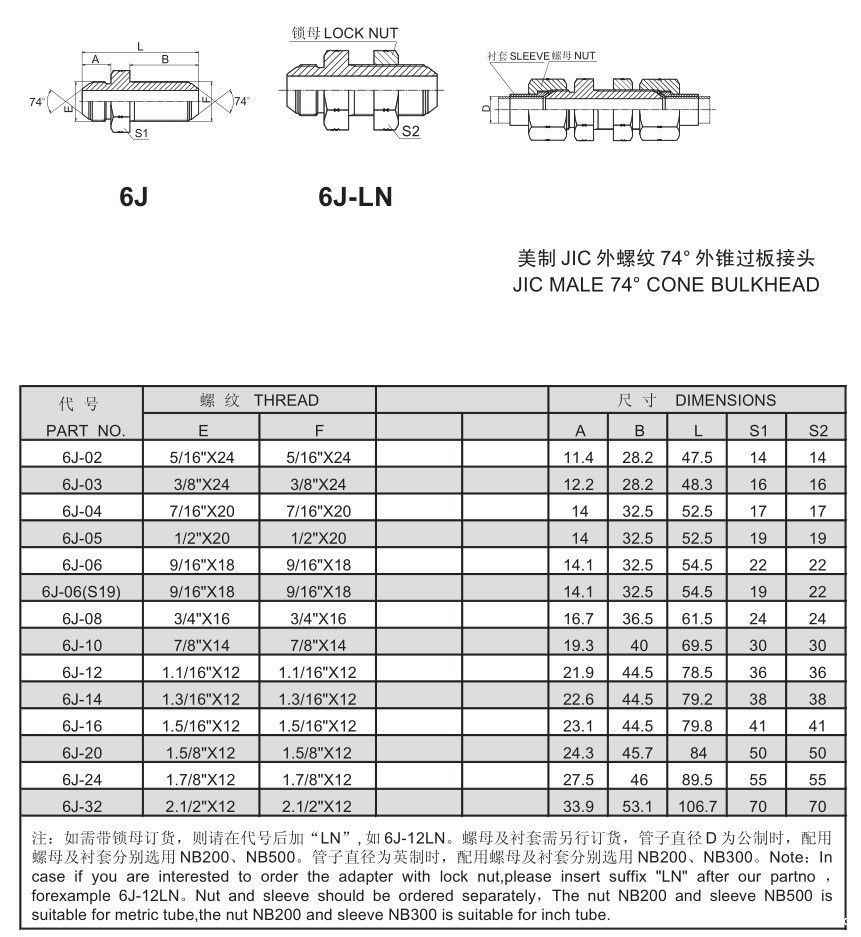 液压接头6J直通双边美制 JIC 外螺纹 74° 外锥过板接头过渡接头